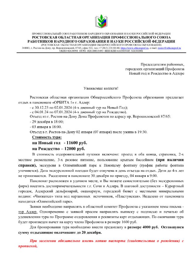 14 ноября 2023 Ростовская областная организация Профсоюза образования предлагает отдых в пансионате «ОРБИТА 1» г. Адлер Поделиться: