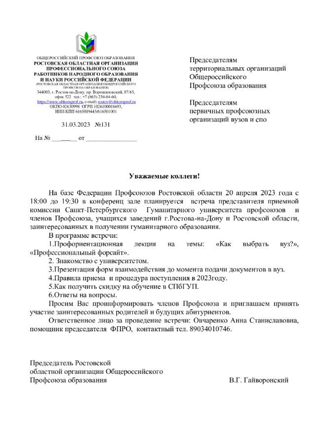 04 апреля 2023 Встреча представителя приемной комиссии Санкт-Петербургского Гуманитарного университета профсоюзов и членов Профсоюза Поделиться: